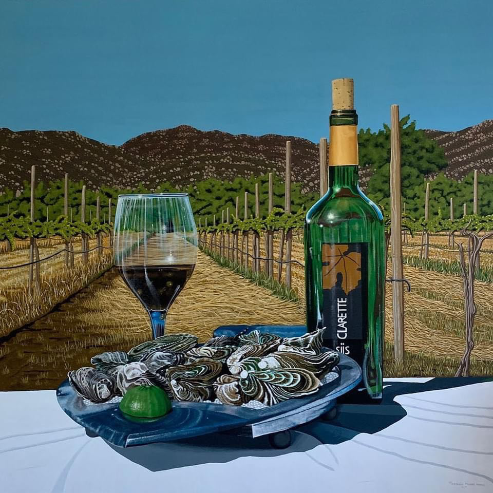 Acontece un día soleado, despejado en el viñedo Barón Balché, valle de Guadalupe, B.C., México. La fiesta del viñedo en flor, apartado del barullo, de forma no ficcionada; encuentro esta composición dispuesta a ser pintada. Naturaleza muerta, típica de Baja California, referente a la comida del mar, con trabajo puntilloso, los ostiones nos invitan a degustarlos;